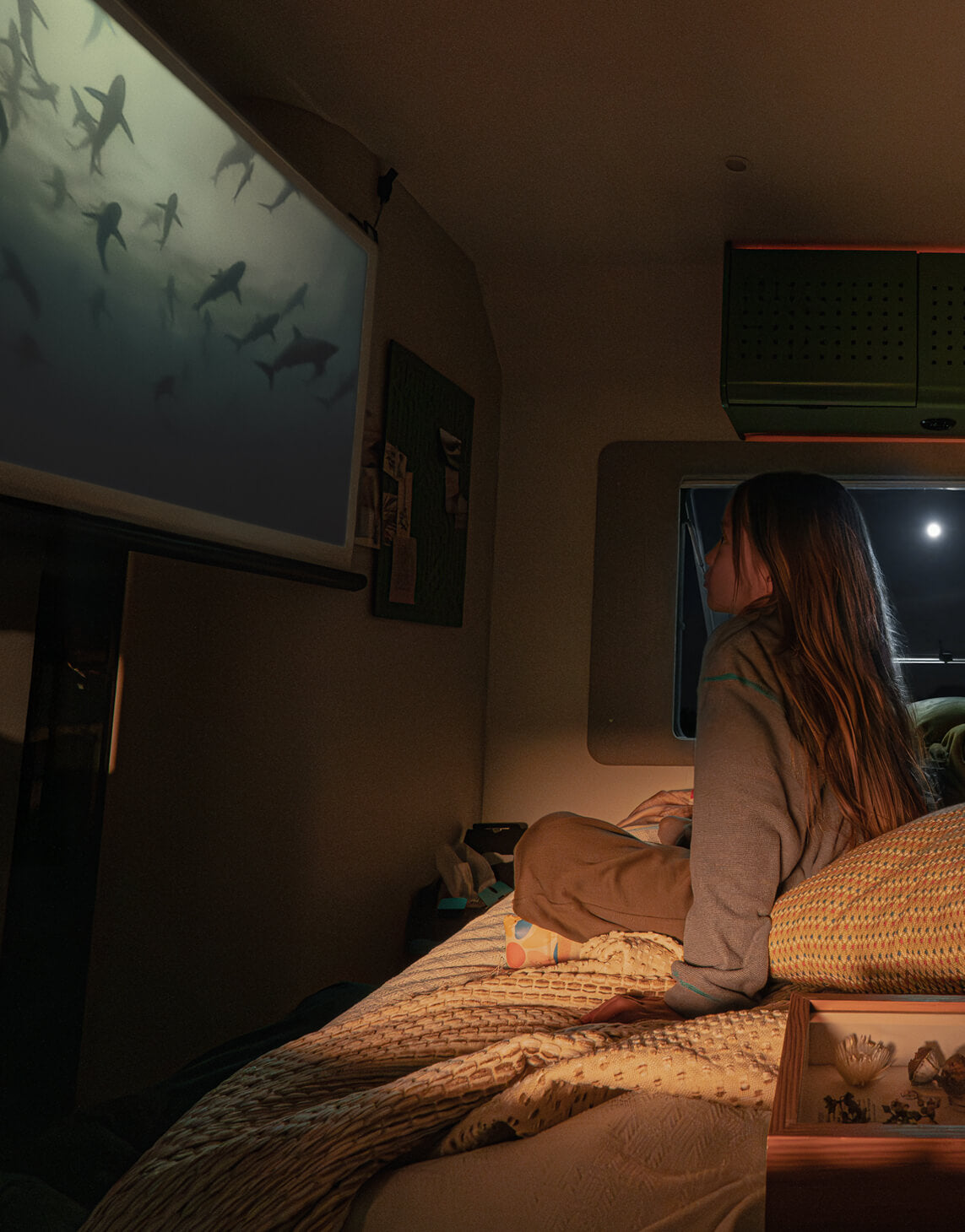 It creates its own power. A unified system of 1.5 kW solar, a 43 kWh LFP battery, and Horizon, our ultra-efficient onboard generator, continuously replenishes energy for HVAC, appliances, and onboard systems.